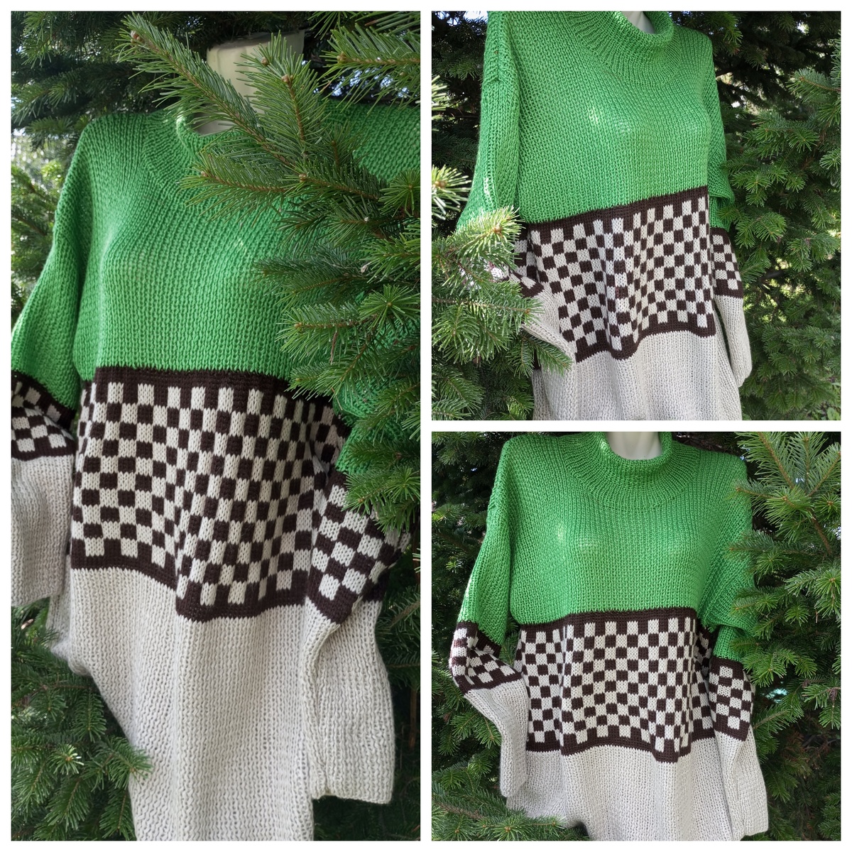 Начинаем готовится к прохладе - вяжем мягкую, тёплую тунику с простым рисунком - квадраты. Идею нашла моя младшая дочь на просторах интернета. В данном варианте модель размера 48-52, связана из бобиной полушерстяной пряжи в пять сложений спицами 3,5 мм и 2 мм. Использовались три цвета - серый, коричневый и зелёный. СПИНКА: на спицы 3.5 мм набираем 130 п нитью серого цвета и вяжем резинкой 1 лицевая, 1 изнаночная 70 рядов. Затем лицевой гладью вяжем 4 ряда коричневым цветом. Затем 40 рядов лицевой гладью рисунком "квадраты" . Затем снова 4 ряда лицевой глади коричневым цветом. Переходим на зелёный цвет и вяжем 70 рядов резинкой 1 лицевая, 1 изнаночная. На высоте 75 см закрываем все петли. ПЕРЕД: вяжем аналогично спинке до горловины. Для горловины на высоте 40 рядов зелёной нитью закрываем средние 14 п, затем каждую сторону вяжем отдельно. Для закругления с каждой стороны закрываем в каждом втором ряду 5 п, затем 4 п, затем 3 п, затем 2 п, затем 1 п. На высоте спинки (70 рядов зелё