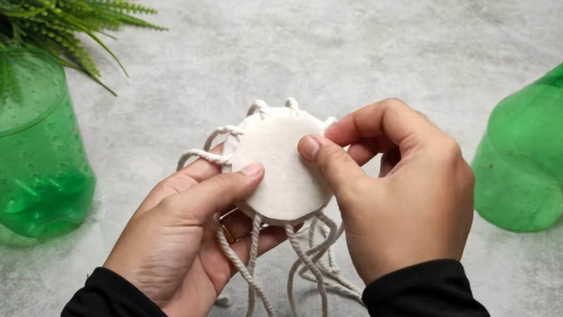 Посмотрите, как из минимума простых материалов — пластиковой бутылки, верёвки, проволоки — мастерица творит очаровательную и вполне практичную вещицу для дома! Работа увлекает и вдохновляет на творчество. Пластиковую бутылку разрежьте ровно посередине пополам — на верхнюю и нижнюю часть соответственно. К нижней приклейте дно, сделанное из картона, на который приклеены 10 отрезов верёвки. Далее, приклейте к самой бутылке ещё одну верёвку и продевайте её через 10 отрезков то сверху, то снизу. Вот такое плетение получится. Закрепите всё клеем, лишнюю длину верёвки отрежьте. Сверху, чтобы закрыть край и задекорировать его, из той же верёвки сплетите косичку и приклейте на горячий клей. К верхней части бутылки приклейте куски проволоки. А в самой пластиковой бутылке вырежьте небольшое окошко. Начните обматывать уже цветной верёвкой бутылку по проволоке. Затем, когда получится достаточно широкая "шляпка", загните проволоку вверх и продолжите обматывать верёвкой. Там, где было вырезано окошко