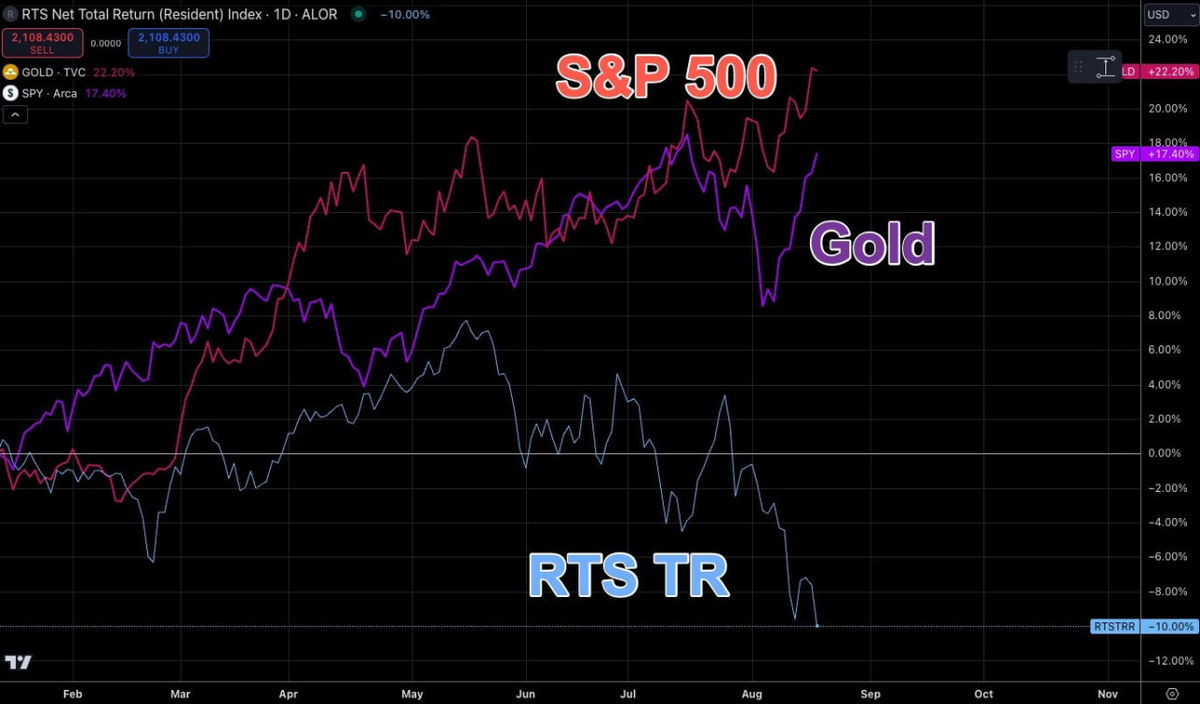 Уже был пост почему предпочитаю выбирать BTC и его сравнение с фондовым рынком РФ, а теперь пришло время сравнить динамику индекса S&P 500, золота и индекса РТС полной доходности в долларах с начала года. На графике все максимально наглядно