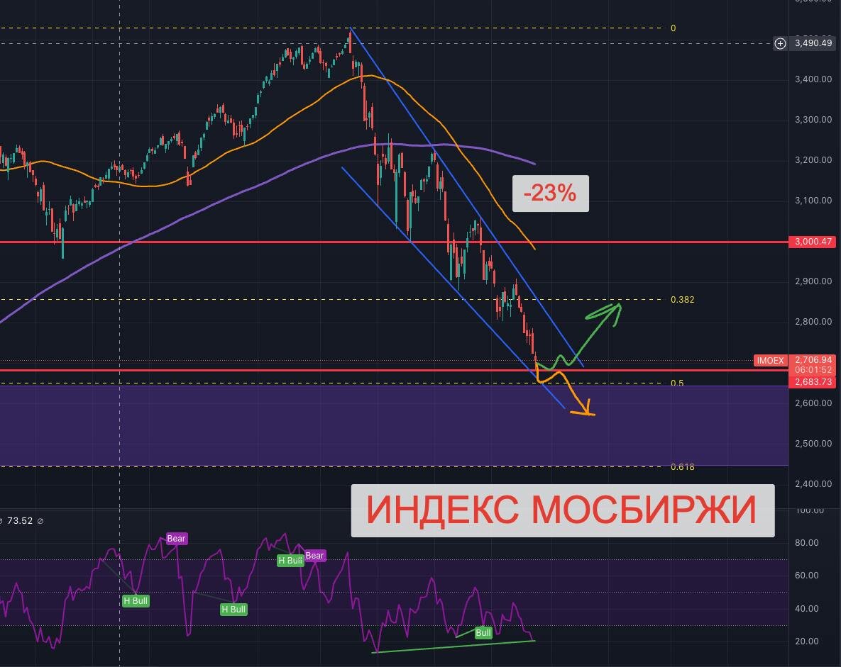 Вот смотрите, на фото график индекса Мосбиржи iMOEX, для тех, кто не а курсе - Это средневзвешенный показатель, который включает в себя 50 самых ликвидных и развивающихся компаний страны по капитализации.