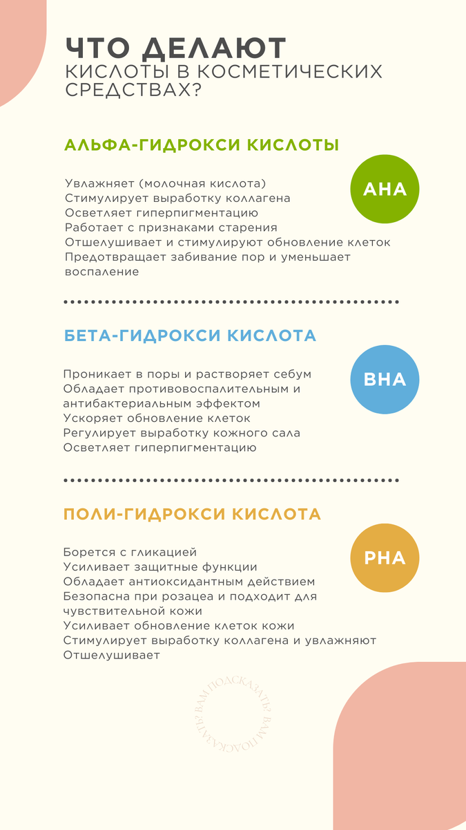Привет. Я автор канала в Телеграм - Вам Подсказать? В этой статье расскажу о кислотах. Эта карточка поможет вам понять, какие кислоты подойдут именно вашей коже. Про то как вводить активы смотрите здесь, а когда ждать от них результата здесь.