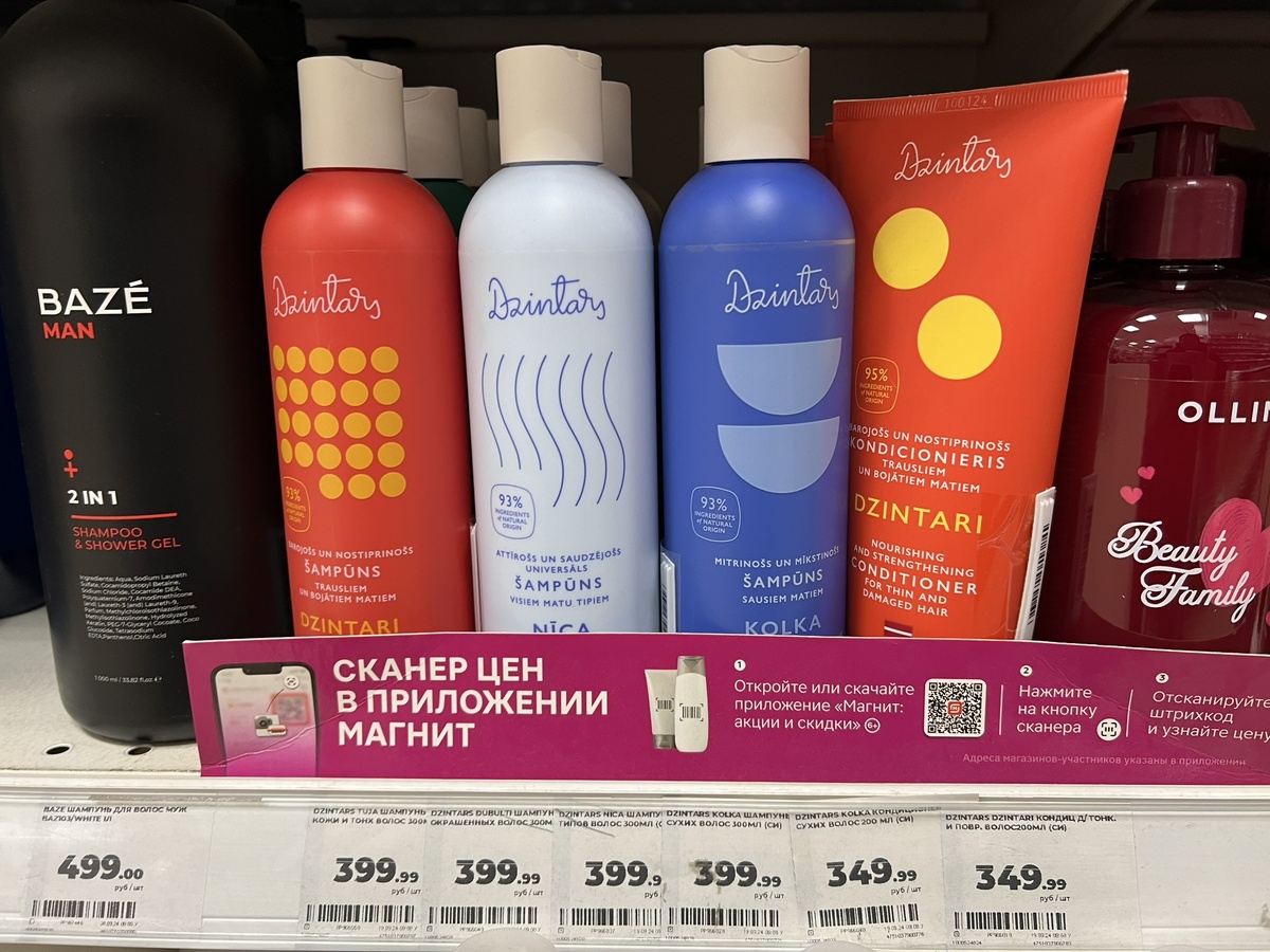 «Тайна рижанки», «Кокетка», «Мистика» – когда-то эти романтические ароматы заменяли жительницам нашей общей страны вожделенные, но недоступные французские «Fidji» и «Poison». И заменяли весьма достойно! Ну, а потом дружить с нами Прибалтика вроде как перестала. Не говоря про то, что теперь. Но не все, оказывается, так однозначно. Санкции санкциями, а денежек-то хочется! И вот вам в доказательство фотографии из "Магнит-Косметик". И они говорят сами за себя. В основном на полках шампуни и кондиционеры. Чтобы вы не сомневались, что это не "Дтинтарс и точка", а косметика именно рижского "разлива", вот вам этикеточка. Но оказывается, что "Дзинтарс" образца 2024 году уже совсем не тот, что знаком, наверно, каждой моднице Советского Союза! Надо сказать, что "Дзинтарс" ведёт свою историю ещё с царских времён. В те времена в Прибалтике проживало немало немцев. Именно так в Риге появился популярный торговый знак фирмы «Бригер», под которым выпускалось мыло, помада, одеколон, зубной порошок и п