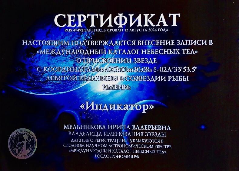 Звезда 9-й величины с координатами α00h01m20.08s δ-02°33'53.5'' теперь официально носит имя "Индикатор". Владелицей наименования является Ирина Мельникова. Этот шаг символизирует наше движение к инновациям, науке и поддержке развития знаний. Почему звезда? Потому что звезды всегда были символом недостижимого, вечного стремления к большему. Звезда "Индикатор" напоминает нам, что нет ничего невозможного, когда есть четкая цель и настойчивость. Этот космический объект символизирует наше непреклонное движение вперед. Сертификат подтверждает внесение записи в "Международный каталог небесных тел", и этот исторический момент зарегистрирован 12 августа 2024 года.
