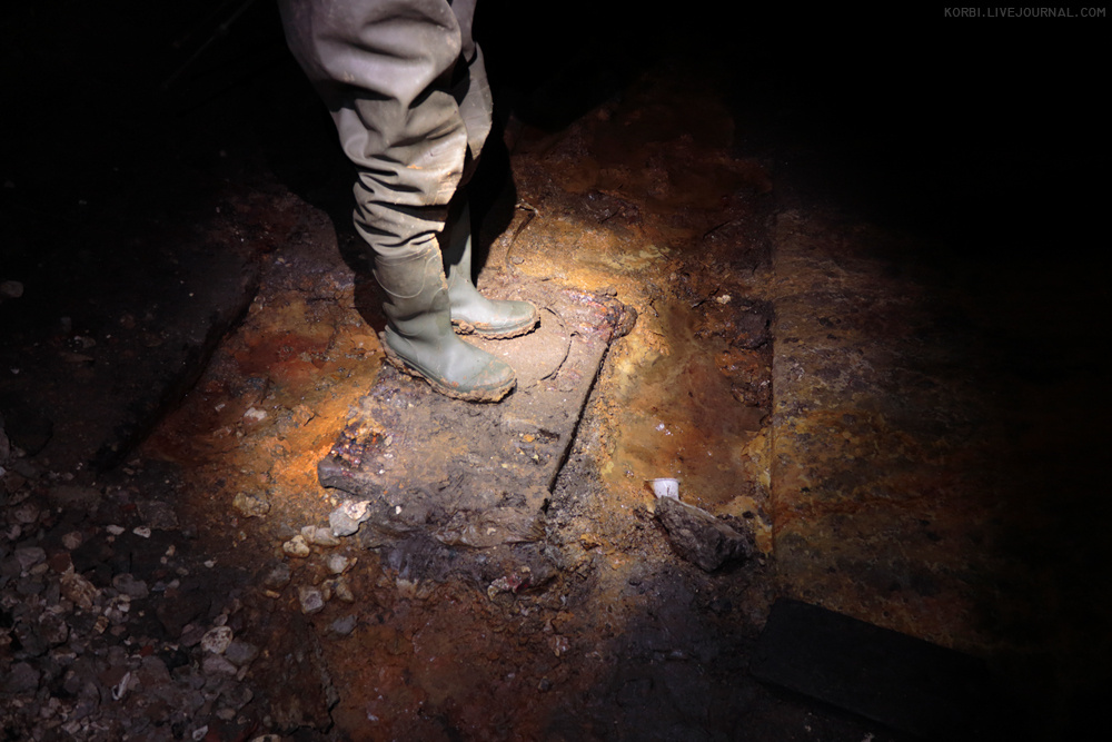 Оригинальную существовавшую толщину свода этого подземного участка достоверно зрительно выявить не удалось – то есть, в доступности был срез коллектора со сводом в 2 кирпича, но, из-за его расположения буквально на грани сопряжения старого и нового участков, нельзя было быть уверенным, что это не более новая часть свода. Или ещё один усиленный коллектор-мост?..