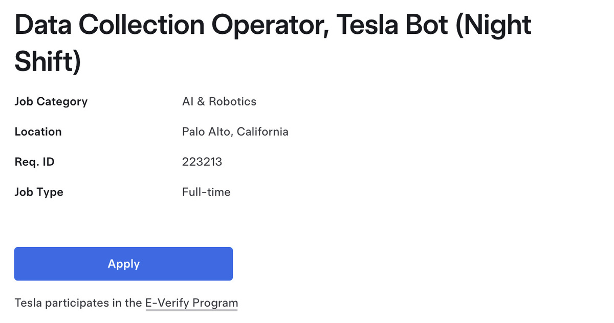 Tesla явно испытывает трудности в гонке по созданию гуманоидного робота, способного выполнять широкий спектр задач — от сборки автомобилей до ухода за детьми. Однако новая вакансия на должность тренера роботов может раскрыть стратегию, которую выбрал глава Tesla Илон Маск для ускорения темпов. Вакансия предоставляет небольшой взгляд на то, как тренируют двуногих роботов Tesla. Кандидаты должны быть ростом от от 170 до 180 см, так как им предстоит носить костюм захвата движения и шлем виртуальной реальности для выполнения определенных движений и действий в соответствии с требованиями. Работа требует от сотрудников загружать данные, собранные в течение дня, писать отчеты по наблюдениям и даже отладки ПО при необходимости. Кандидаты должны быть способны ходить по 7+ часов в день и переносить до 14 кг — многим это явно придется не по плечу. Также интересны часы работы, описанные в вакансии. Доступны три смены: с 8:00 до 16:30, с 16:00 до 00:30 и с 00:00 до 8:30. Такие смены не редкость для