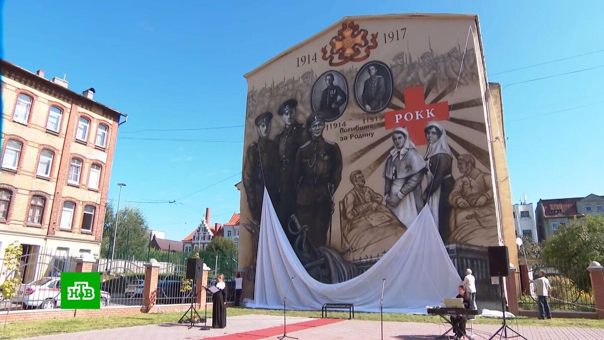 [ Смотреть видео на сайте НТВ ] В Калининградской области в рамках празднования Царских дней, которые с 2019 года ежегодно проводит в регионе фонд «Елисаветинско-Сергиевское просветительское общество», сегодня открыли масштабный мурал. Монументальная живопись на одном из исторических зданий посвящена подвигу русских воинов в Первой мировой войне, а также историческому прошлому Черняховска — бывшего Инстербурга и его связи с царской семьей. Анна Громова, председатель наблюдательного совета фонда «Елисаветинско-Сергиевское просветительское общество»: «Наш президент говорит, историческая память — это наше стратегическое оружие и вопрос сохранения, преемственности исторической памяти — это вопрос национальной безопасности. Мы знаем к чему приводит потеря исторической памяти, мы результаты этого видим у нас в мире. И поэтому нам очень важно, чтобы наши дети знали историю, чтобы они знали героический пример великой войны, Второй мировой войны, Великой Отечественной войны, чтобы они учились н