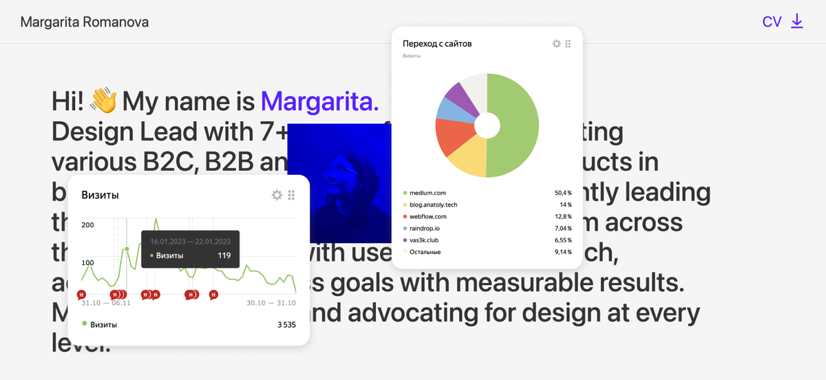 Нарисовав концепт в Figma, я решила самостоятельно сверстать сайт на Webflow. Это не заняло у меня много времени и я начала активно рассылать резюме и портфолио в интересующие меня компании. После этого, я довольно быстро столкнулась с проблемой, что не понимаю, насколько эффективно сайт выполняет свою задачу, ведь, к сожалению, очень редко можно получить честный и полезный фидбек от нанимающего менеджера или HR. А вопросы продолжали появляться. Заходит ли на сайт хоть кто-то? Сколько моих проектов посещает один человек? Какие проекты самые интересные? А какие наоборот заставляют человека принять отрицательное решение о моей кандидатуре?
