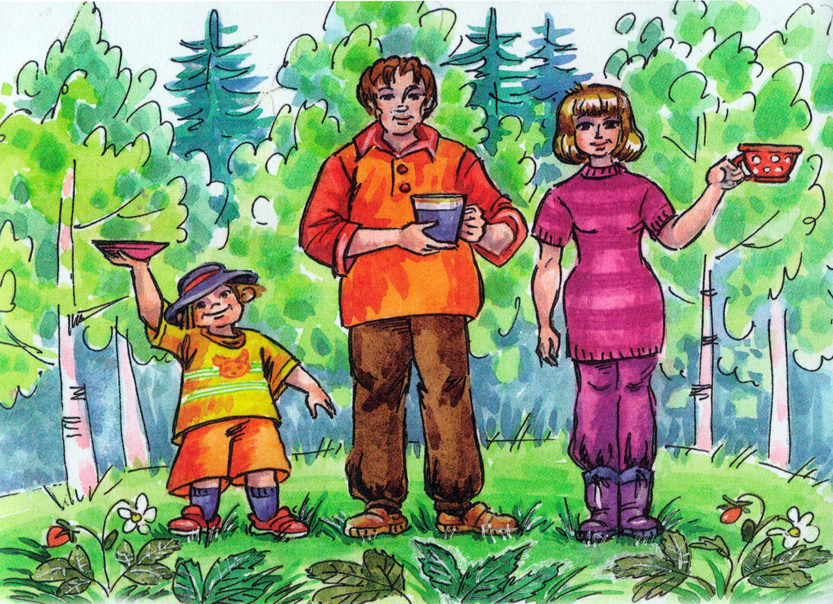 - Мама — мать Жени, заботится о дочери и выбирает для неё полянку для сбора ягод.