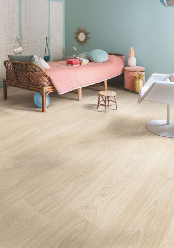 С этого года завод Quick Step сделал все свои коллекции влагостойкими: теперь ламинат, производимый на его конвейерах, выдерживает от 24 до 72 часов нахождения воды на поверхности. 72 часа - это очень много, и далеко не все покупатели хотят до такой степени обезопасить пол от влаги, многим предпочтительнее купить ламинат подешевле, и 24 часа влагозащиты им вполне достаточно. В таких случаях мы предлагаем коллекцию Classic: это 20 натуральных декоров в классическом стиле. Цвета и оттенки варьируются от очень светлого до темно-коричневого. Толщина 8 мм, 32 класс, сертифицирован по ГОСТ и по евростандарту. Натуральная структура поверхности делает это напольное покрытие антискользящим. Разрешено к укладке на теплые полы с максимально допустимой температурой 27 градусов. Есть точно такие плинтуса и порожки. Один из наиболее популярных декоров - Дуб бежевый премиум CLH4093. Он универсален, подойдет в комнаты любого предназначения, с интерьером в любой цветовой гамме. Дуб горный Коричневый C