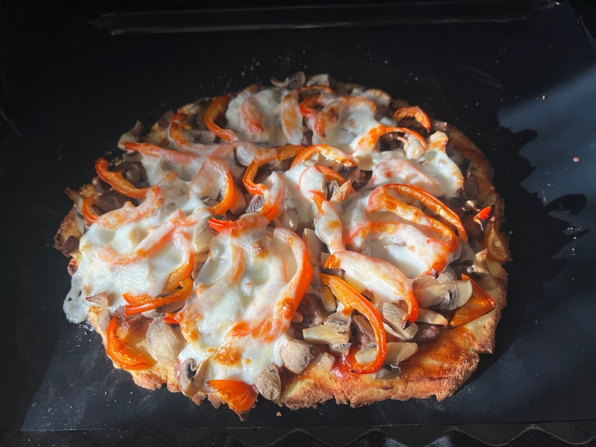 Это хороший вариант завтрака, сытный и много белка. Я готовлю на несколько дней, одну пиццу делю на 4 части. Могу одну или две части заморозить на случай форс-мажора. Тесто готовлю обычное твороженное, но без сахарозаменителя - не сладкое тесто. Ингредиенты: Тесто: Начинка: Приготовление: Предварительно очищаем, нарезаем, промываем и отвариваем шампиньоны. Пастрому я делаю сама из грудки индейки, но можно взять и запеченную индейку. Нарезаем кубиками. У меня в этот раз запеченное бедро индейки. *творог лучше брать менее зернистый или перебить блендером, чтобы тесто было более однородным. Творог соединяем с мукой и яйцом, тщательно смешиваем, добавляем разрыхлитель, и еще раз тщательно перевешиваем (не сладкое твороженное тесто). Формируем из теста шарик. Выкладываем тесто-шарик на тефлоновый коврик и раскатываю через пакет, чтобы тесто не липло. Смазываем соусом барбекю и посыпаем специи, выкладываем начинку (кроме сыра). Убираем в заранее разогретую духовку до 180С на 20 минут, зат