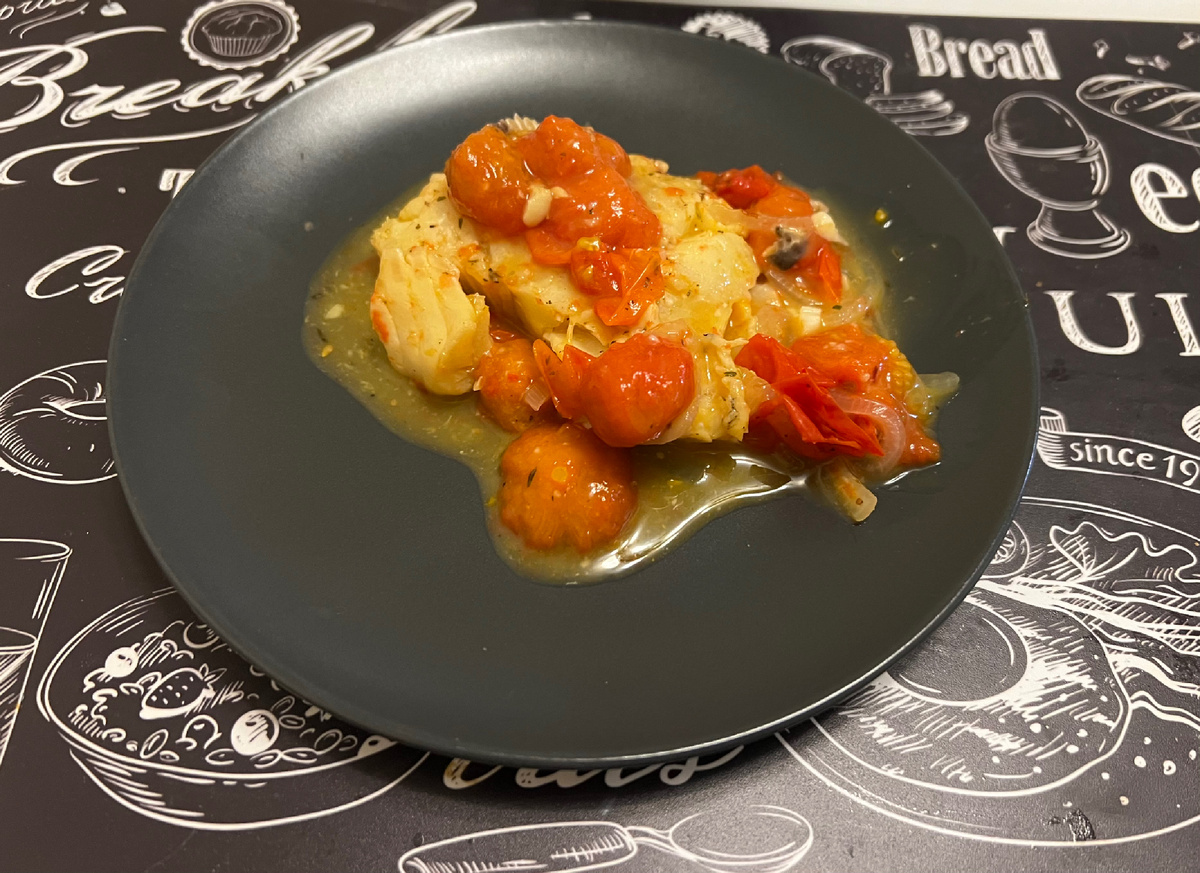Экспресс вариант ужина. Добавляем гарнир и салат для полноценного приема пищи. Нам понадобится: Приготовление: Нагреваем сотейник, выкладываем черри и лук, предварительно нарезанный полукольцами. Пассируем на медленном огне и добавляем соус чили. Филе трески нарезаем и выкладываем сверху на овощи, посыпаем травами, солью и чесноком. Тушим 10-15 минут, затем оставляем томиться под закрытой крышкой на 20 минут. Рыба получается тушенной, не жареной. Приятного аппетита!