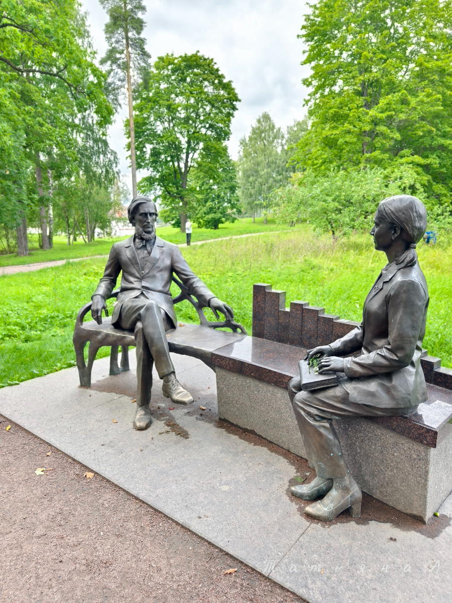 Добрый день, дорогие читатели! Хочу рассказать про памятник "Связь поколений" в Приоратском парке города В Приоратском парке города Гатчины вблизи старейшей гатчинской школы № 4 в 2023 году установлена скульптурная композиция «Связь поколений. Ленинградский учитель». Автор скульптурной композиции — петербургский скульптор Арутюн Зограбович Акобян. Его проект победил в областном творческом конкурсе. Композиция представляет собой две фигуры – легендарного педагога Константина Дмитриевича Ушинского и молодой учительницы, сидящих друг напротив друга на скамье. Ушинский, придерживавшийся взглядов о важности образования для всех и умевший внедрить в свои педагогические практики дух настоящего товарищества, прошел свое становление как педагог в стенах Гатчинского сиротского института. В период службы в Гатчинском институте им были написаны важнейшие педагогические работы, такие как «Три элемента школы», «О народности в общественном воспитании» и другие. В 2023 году отмечается 200-летие со