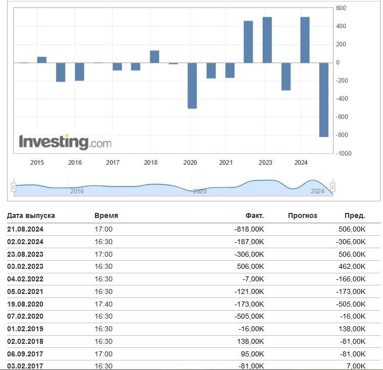 Пересмотр американской статистики труда вызвал прямо переполох у российских комментаторов. «Свыше 800 тыс занятых просто «пропали без вести», испарились» Действительно, численность занятых в несельхозэкономике США при пересмотре данных оказалась ниже на 818 тыс.чел. Статистика по рынку труда — одна из самых ненадежных в любой стране. Предварительные данные по безработице получаются путем выборочного опроса людей, суммируются с предыдущими данными, набегает ошибка. Потом приходят отчеты компаний о занятости и выявляется ошибки с предварительными данными. Уточнение их — обычная процедура. В США она приходит 1-2 раза в год. Пересмотр 21 августа оказался очень высок. 0,5% в численности занятых (обычно они меньше — ок. 0,1%). Считать, что это какое-то политически мотивированная манипуляция никаких оснований нет. Собственно, никто, кроме некоторых российских пропагандистов, и не высказывает таких подозрений, даже трамписты в США. Потому что если бы это была политика, то с таким невыгодным де