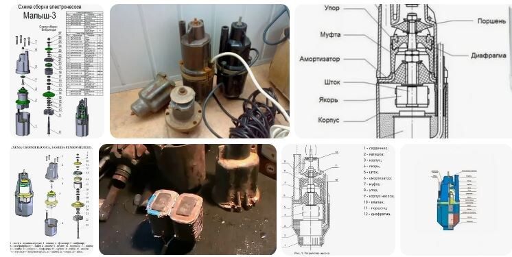 У огородников и дачников очень популярны погруженные вибрационные насосы типа «Малыш», . Они недорого стоят, производительны, создают достаточно большое давление и обладают большой прокачиваемостью . Но, к сожалению, эти насосы не очень надежны. Причем их поломки весьма разнообразны. Где клапана прохудятся, где тяга оборвется, проблемы с обмоткой насоса, силовым магнитом, короткое замыкание или обрыв. Встречается довольно много и простых неисправностей, которые легко устраняются, но после ремонта, например замене резиновых клапанов, насос не качает или качает очень слабо. Здесь нужно еще правильно отрегулировать и собрать насос.