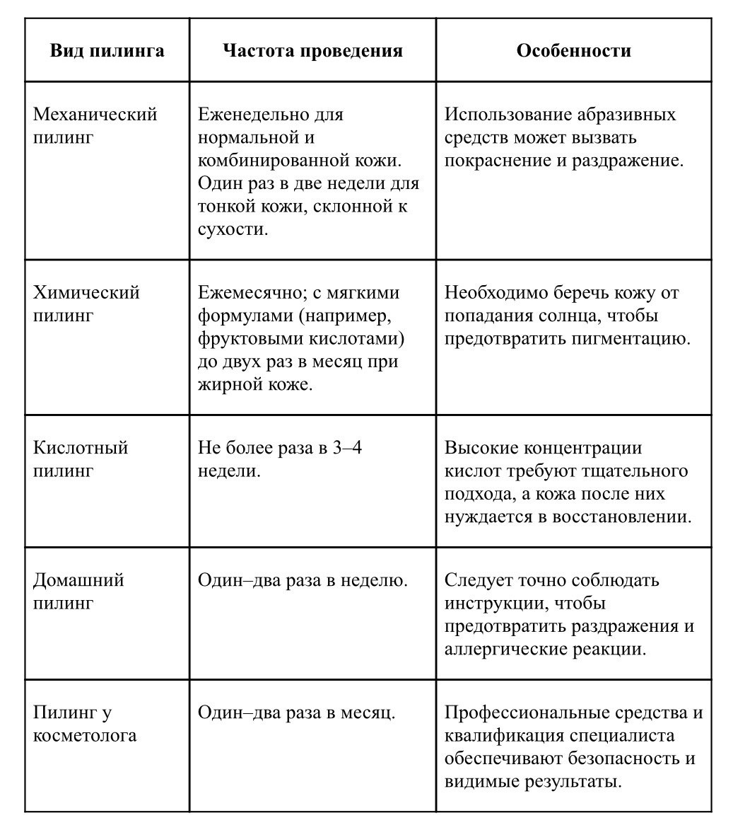 Каждый из видов пилинга должен проводиться с определённой частотой, чтобы достичь лучших результатов и предотвратить травмирование кожи. Важно понимать, что частота определяется особенностями кожи, возрастом и активным ингредиентом используемого препарата.