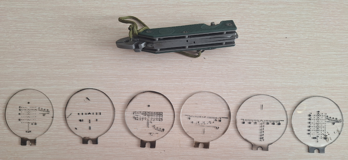 Не скажу, что довольно редкие эти "стеклышки", но не слишком часто встречаются. Применяются они для обучения личного состава. И были времена, когда мне их ОЧЕНЬ не хватало. Приходилось применять свои художественные навыки (которые напрочь отсутствуют) и рисовать сетки прицелов на доске или бумаге. Что не очень удобно.