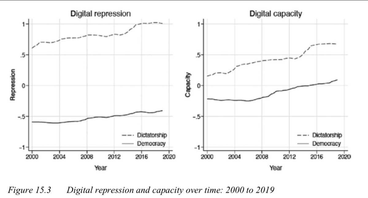 Дальше у Эрики Франц обнаружил вот какой график: разница в степени применении репрессий при помощи цифровых технологий (digital repression) и разница в технологическом потенциале (digital capacity) между авторитарными и демократическими режимами. Автократии чаще прибегают к репрессиям в цифровом пространстве, обладая при этом более низкими технологическими возможностями.