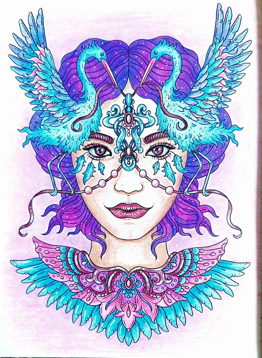 Раскрасила портрет девушки из раскраски "Заколдованный лес" Ханны Карлсон.