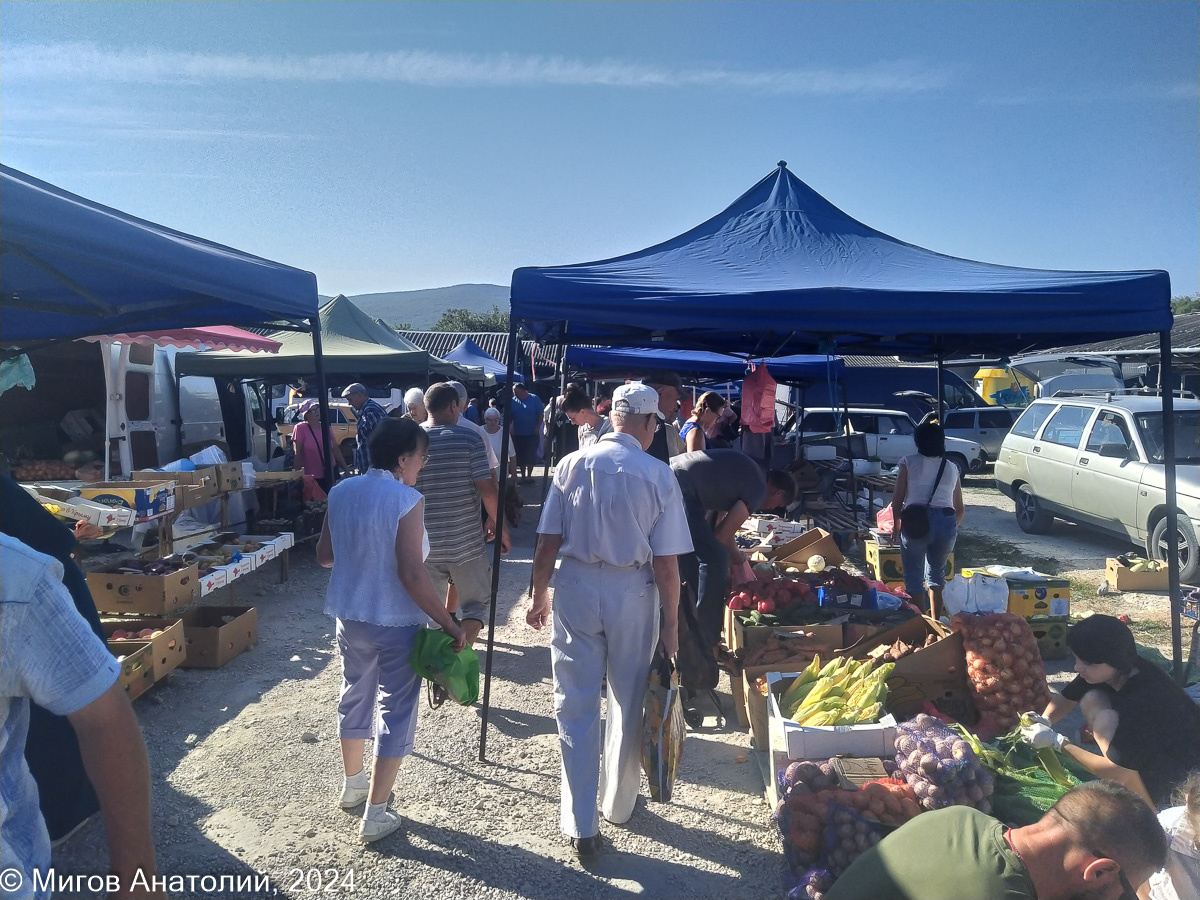 Идём на наш городской рынок в последнее воскресенье крымского лета-2024. Воскресный рынок у нас бодр и многоголос. Ещё нет восьми часов, а улица, ведущая к рынку, уже запружена покупателями. Продавцы торгуют на обочине прямо с колёс.