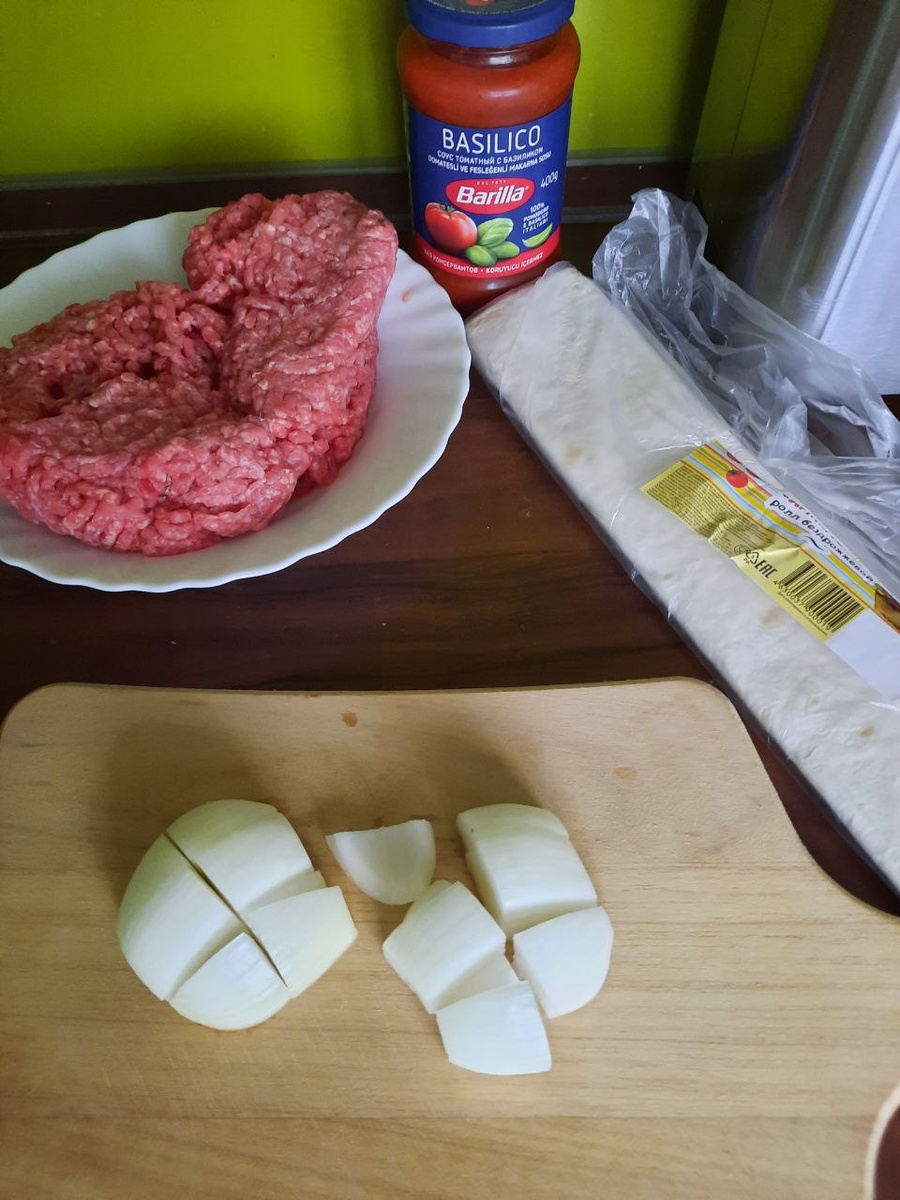Форму смазать маслом. Выложить нижний лист лаваша. Сверху фарш. Сверху присыпать сыром. Опять лаваш, фарш, сыр. У меня получилось три слоя.