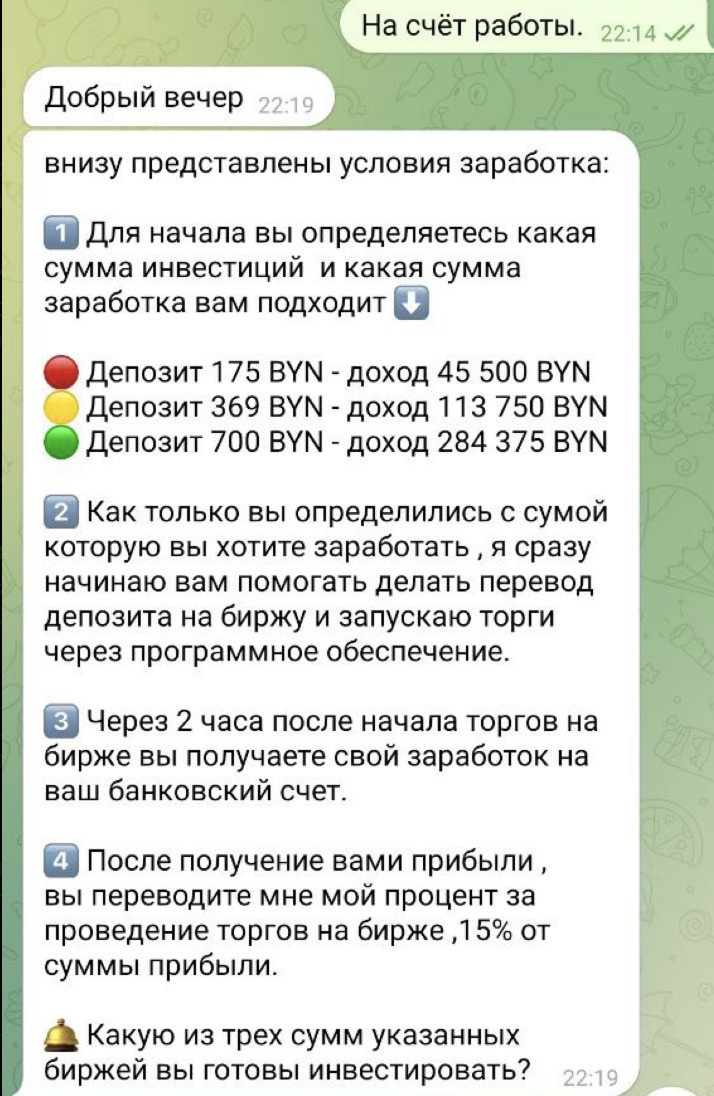 В редакцию прислали мегазаманчивое предложение о подработке, которую сейчас предлагают белорусам в Telegram. Вначале вы определяете сумму инвестиций и желаемую сумму заработка. Предлагаются следующие варианты: Депозит 175 рублей — доход 45 500 рублей. Депозит 369 рублей — доход 113 750 рублей. Депозит 700 рублей — доход 284 375 рублей. Через два часа после начала торгов вы получаете свой заработок на банковский счет. Еще раз: за два часа тут обещают увеличить ваш депозит на 25 900—40 525%. Как вам такое? Конечно, как бы сказочно все это ни звучало, есть и ложка дегтя. После получения дохода на карточку банка вам необходимо будет перевести 15% от суммы брокеру (это якобы его «хлеб»). Непонятно, зачем ему все это, если он умеет делать такие иксы за считаные минуты, ну да ладно. На самом деле, никаких доходов у вас не будет. Это очередные мошенники, которые либо исчезнут сразу после перевода им средств, либо попытаются создать вам иллюзию заработка и вытягивать еще по чуть-чуть на всякие