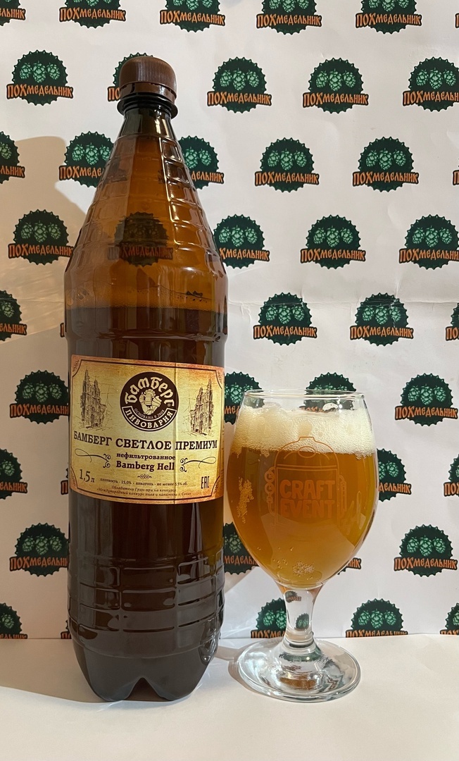 Статистика: светлое пиво, низового брожения, нефильтрованное, непастеризованное, алкоголь - не менее 5.5% об., плотность - 15.0%, состав: специально подготовленная вода, солод пивоваренный ячменный светлый, карамельный, хмель, дрожжи пивные низового брожения. Объём: 1,5 л Дата розлива в бутылку: 19.08.2024 Изготовитель: ООО «Бамберг Бир», Россия, г. Волгоград По-братски: в общем, не стал я откладывать в долгий ящик дегустацию оставшихся сортов от нашего местного ресторана и пивоварни «Бамберг». Взял и целенаправленно поехал закупился и вот теперь спокойно сижу дегустирую. Вообще у них там красота в ресторане, барная стойкая с кучей кранов, где бармены постоянно разливают в кружки холодное свежее пиво, кто-то как я, берет с собой на вынос, пахнет варящимся свежим пивом. В общем, просто настоящая атмосфера удовольствия и наслаждения. А что пиво? Аромат дрожжевой, немного солодовый, была пенная шапка, во вкусе яркая горечь, приятный солодовый тон, полнотело, хорошая газация. А вот это пив