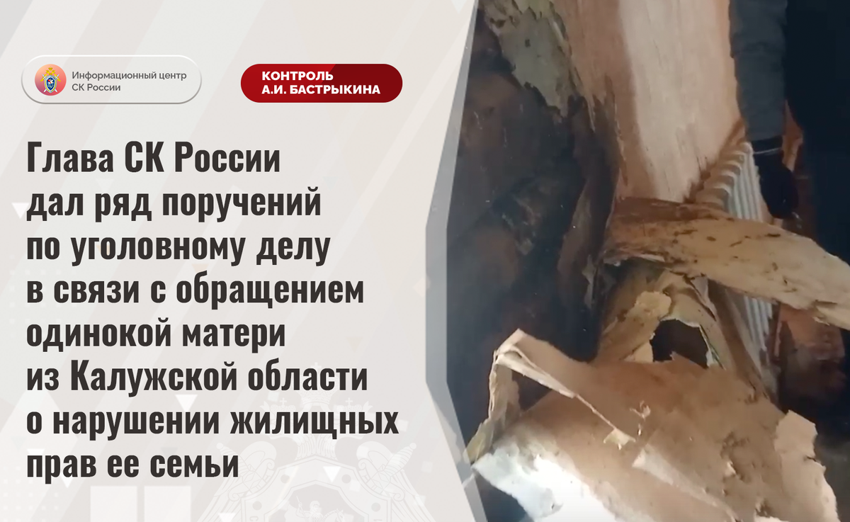 Глава СК России дал ряд поручений по уголовному делу в связи с обращением одинокой матери из Калужской области о нарушении жилищных прав ее семьи В комментариях в аккаунте приемной Председателя СК России «ВКонтакте» обратилась одинокая мать из Калужской области о несогласии с ходом установления обстоятельств нарушения жилищных прав ее семьи. Женщина получила субсидию на покупку жилья по программе «Молодая семья», после чего в 2014 году приобрела половину жилого дома в поселке Полотняный завод. Однако после подписания договора купли-продажи и передаточного акта она обнаружила, что жилье в результате проведенной соседом незаконной реконструкции непригодно для проживания: в стенах образовались трещины, протекает крыша, из-за сырости появилась плесень. Выездная комиссия признала дом аварийным. Заявительница с ребенком осталась без жилого помещения. Ранее глава СК России поставил ситуацию на контроль в центральном аппарате ведомства. В СУ СК России по Калужской области с августа прошлого го
