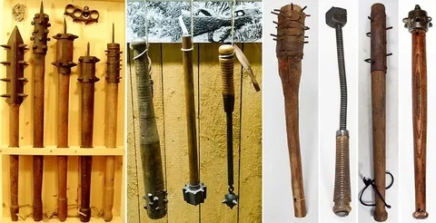 Однако развитие шло не только по линии упрощения. Тогда же, в ХII—ХIII веках, появились навершия весьма сложной и совершенной формы – с шипами, торчавшими во всех направлениях таким образом, чтобы на линии удара в любом случае оказался выступ – один или несколько. Эти навершия в основном отливали из бронзы, что первоначально ввело учёных в досадное заблуждение: в музейных каталогах и даже в научных трудах их причисляли к эпохе бронзы лишь на том основании, что они были сделаны из упомянутого металла!