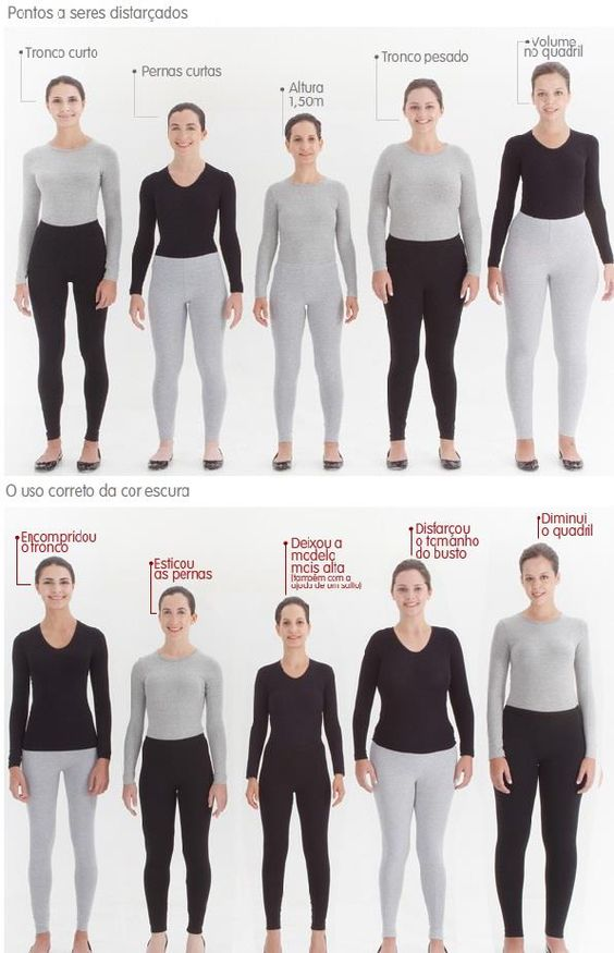 Как работает: мелкий вырез укоротил шею и верхнюю часть тела (смещение линии низа футболки тоже работает на это) и удлинил ноги. Вырез под горло добавляет объема груди, а значит уравновешивает фигуру и делает бедра уже. Цвет здесь тоже имеет значение, но соотношение длин/вырезов работает не хуже цвета. Линия талии на нижней картинке точно на самом узком месте и закрывает его (а на верхней – чуть ниже тонкого места и подчеркивает), таким образом, талия кажется шире (помним об этом, когда носим ремешок точно на линии талии!), контраст между бедрами и талией стал меньше, бедра кажутся уже.