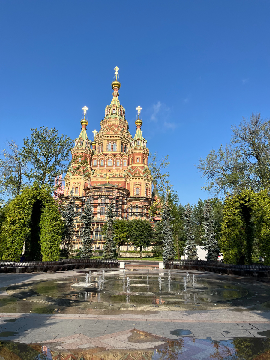 Начну по порядку. Теплым августовским утром, я с дочкой решила посетить Петергоф. Изначально, я хотела посмотреть на вновь открывшийся после реставрации Верхний парк. Ну и где-нибудь недорого позавтракать. Так как я искала место в раскрученном туристическом пригороде, то много времени на поиски мне не понадобилось. Мое внимание привлекло кафе «Курасаныч» на торговой площади дом 8. У кафе отличные отзывы, и оно очень удачно расположено. С одной стороны, есть где припарковаться, а с другой, недалеко идти до знаменитых дворцовых парков, один из которых я и собиралась осмотреть. Ну что ж, как говорится ноги в руки и поехали. Дорога по кольцевой в утренние часы выходного дня заняла всего около 25 минут. Видимо народ еще не проснулся))). Запарковавшись на бесплатной парковке, я уже было собралась иди в сторону кафе, но мое внимание привлекла скульптура в сквере на другой стороне дороги, прямо перед Собором святых апостолом Петра и Павла. Собор хоть и реставрируется, но все равно очень к