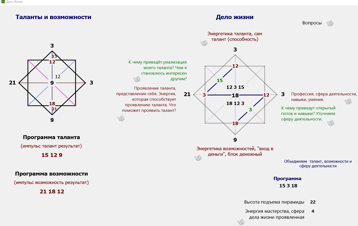 У нас есть также понятие "дело жизни". Для расчёта мы собираем воедино 3 и 5 чакры, то есть деньги и таланты, добавляем высоту, которая задаёт объём, и получаем программу.