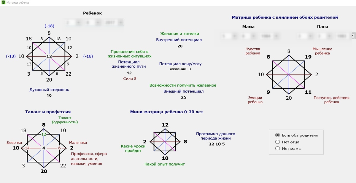 Также в матрице ребёнка мы считаем программу периода (прогностика) от 0 до 20 лет, и можем посмотреть потенциал числа, месяца и года рождения.