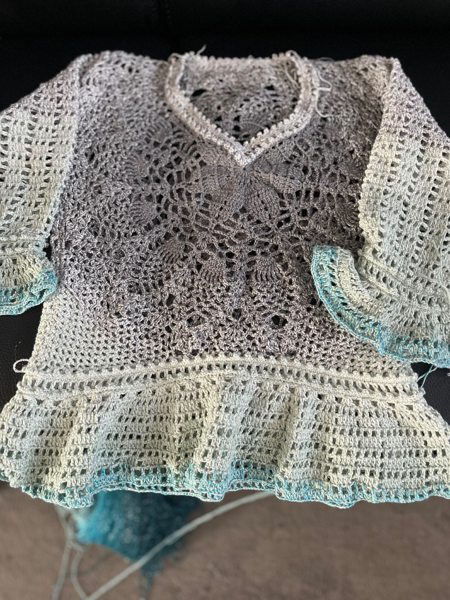 Что есть на сегодня. Это ярн арт фловерс мунлайт. Вяжу от двух мотков, нитку рву, так как хочу получить одинаковые рукава.