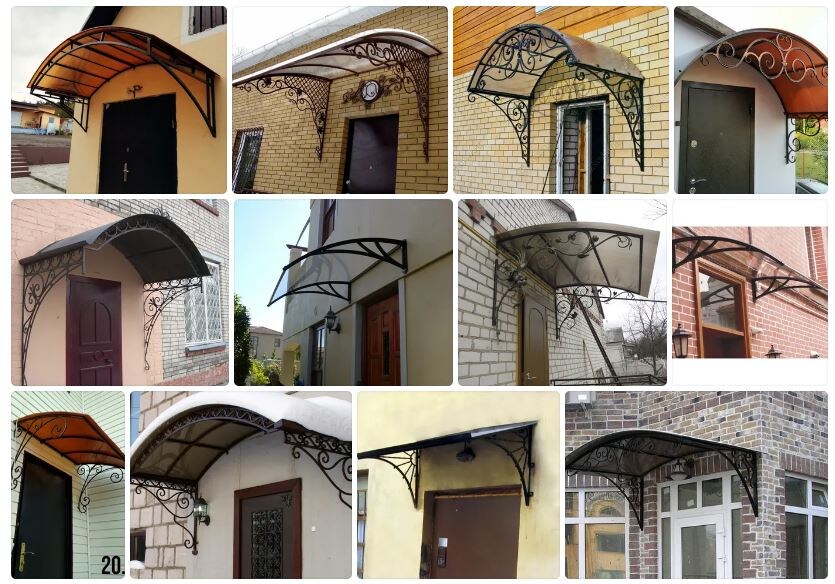 Козырьки над входной дверью фото можно найти на сайтах производителей козырьков. Сейчас в моде козырьки из металлоконструкций и поликарбоната. Обычно делают каркас с фигурными элементами, иногда кованными, а кровельное покрытие поликарбонатное. Цена такого козырька примерно 50000 рублей. Можно и самому сделать его, если иметь навыки сварочных и кузнечных работ.