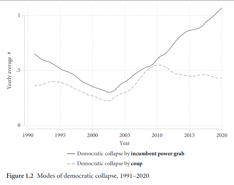 В интересной работе от Эрики Франц, Андреа Кендэл-Тэйлор и Джозефа Райта нашёл следующую статистику. Примерно с 2010-х (а сам тренд стал заметен еще с 2000-х) среди всех случаев коллапса демократии 64% пришлись на глав государств, решивших развалить демократические институты изнутри и узурпировать власть. И всего 36% пришлось на государственные перевороты. Какие недавние кейсы можно указать в качестве примера?