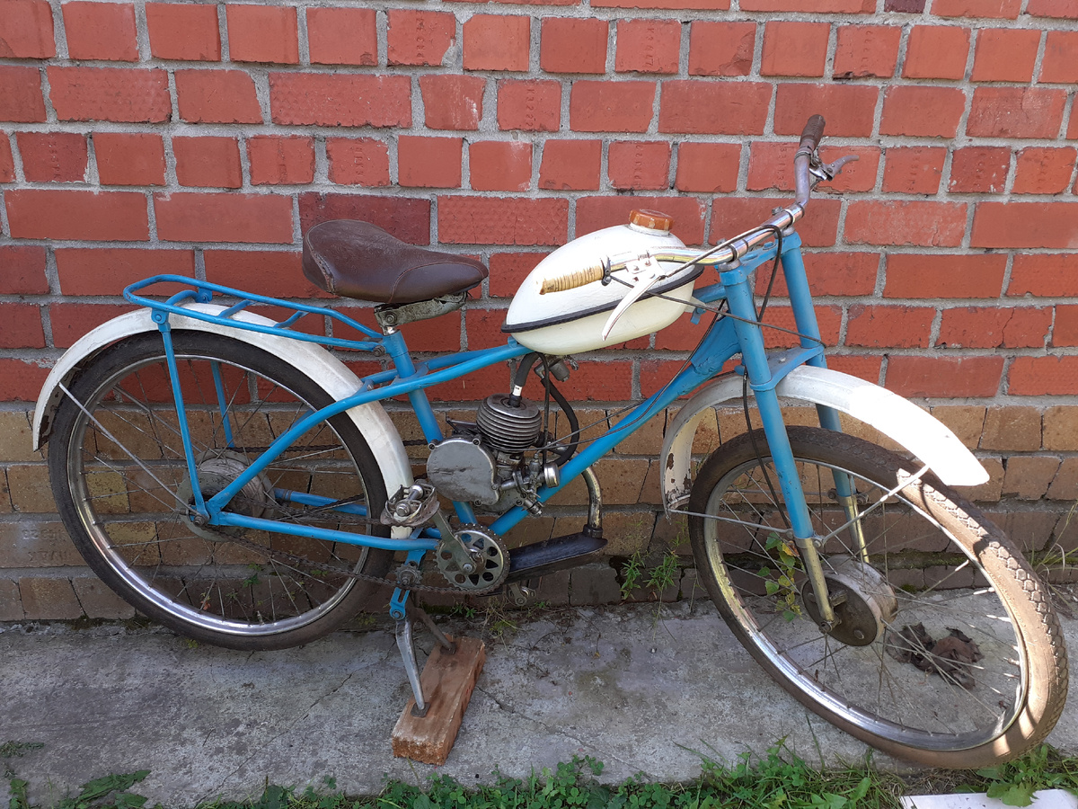 Приветствую заглянувших! Выделил немного времени уделить внимание своей Риге 5. В течение года были куплены глушитель с патрубком и, большая редкость - фара в состоянии новой. Напомню, что у двигателя Д5 ещё не было обмотки освещения и единственный источник света - переднюю фару, предполагалось запитывать, как на велосипеде, динамкой. Фара, хотя внешне и похожа на распространенные на рижских мопедах ФГ-306 (7, 11, 13), но отличается способом крепления - на специальном кронштейне за единственное ушко. Прикинул фару и понял, что нужно поскорее заняться изготовлением кронштейнов крепления. Найти оригинальные малореально. Держа фару в руках, сначала удивился наличию отверстия в верхней части корпуса. Но потом по фото из интернета понял, что туда должен ставиться тумблер её включения. Далее прикрутил глушитель. Он точно был нужен, т.к. следующий этап - уже попытка запустить двигатель. Смутило, что он не встал на место - как будто не хватает длины патрубка. Но позже сообразил, что возможно