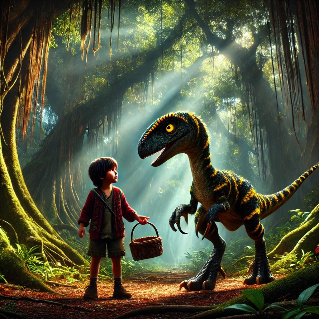 Этим летом со мной приключилось такое! Если бы кто-то рассказал, сам не поверил бы. Я жил в нашей мезенской деревне Кимже. Стоял июль, было жарко. Однажды после дождичка взял я корзинку и отправился за грибами. Лес у нас красивый! Иду по тропинке из мягкого мха и хвои мимо красных стволов сосен и зелёных ёлочек. Птички поют, комары жужжат, дятел стучит. Хорошо, только грибов не видно. Тропинка ведёт меня всё дальше в лес. Шагаю я и вижу – деревья становятся выше и толще и листья какие-то длинные, треугольные. Присмотрелся – папоротник. И ещё кусты с узловатыми ветками, много фиолетовых цветов с длинными жёлтыми усиками. Что за чудеса, сколько здесь хожу, ни разу не видал этого места. Но чудеса были впереди, я просто прирос к месту, когда увидел того, кто выскочил передо мной из кустов. Он был с полметра размером и весь какой-то удлинённый: длинное узкое тело, длинные голова и ноги с длинными подвижными когтистыми пальцами и, конечно, очень подвижный хвост. Весь покрыт чёрно-жёлтыми и н