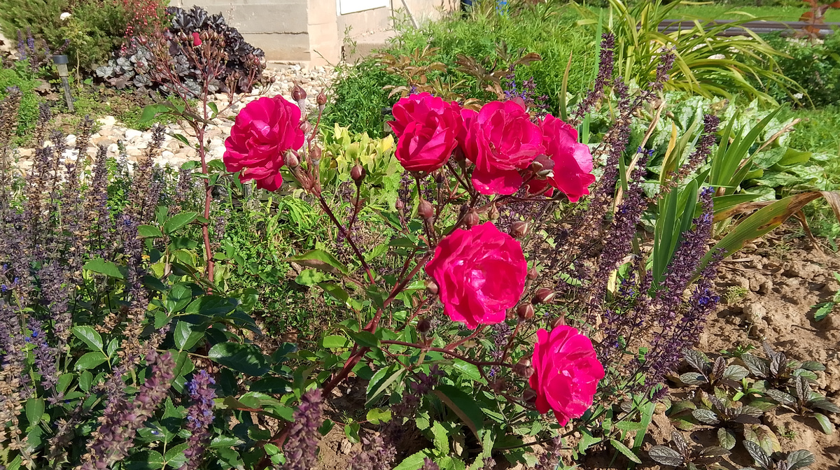 Еще один не самый очевидный вариант, который мне тем не менее нравится, - это укорененная мной срезочная розочка, которая редко но радует меня невероятно красивыми по форме и цвету бутонами. В ходе недавней переделки Неирисового бордюра я собрала эти розы двумя группами по три штуки, надеюсь, это поможет создать картину чуть более массового цветения. По соседству второй волной цветет лаванда.