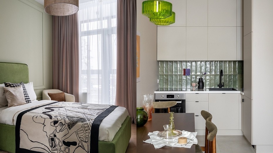 Женщина обратилась к дизайнерам за тем, чтобы оформить интерьер для своей мамы. Квартира расположена в современном ЖК, но в месте, приближенном к природе. И это отразилось в интерьере. Фото: Екатерина Гейц. Стиль: студия Composition_9 Женщина обратилась к дизайнерам Antis Studio с просьбой оформить интерьер квартиры для своей мамы. Квартира расположена в современном ЖК в городском округе Красногорска в Московской области. Расположение в зеленой зоне подсказало оформление интерьера — природный, расслабляющий после шумного мегаполиса. Изначальная планировка сегодня называется евродвушкой — кухня-гостиная, отдельная спальня, ванная комната. Между прихожей и кухней построили перегородку с нишей для встройки шкафа со стороны входной зоны. Увеличили дверной проем в санузел. Больше никаких изменений в планировке не проводили. Стены окрашены краской, подбирали похожие оттенки бежевого для кухни-гостиной и прихожей. В спальне — приглушенный зеленый цвет стен. На полу гостиной и спальни — инжене
