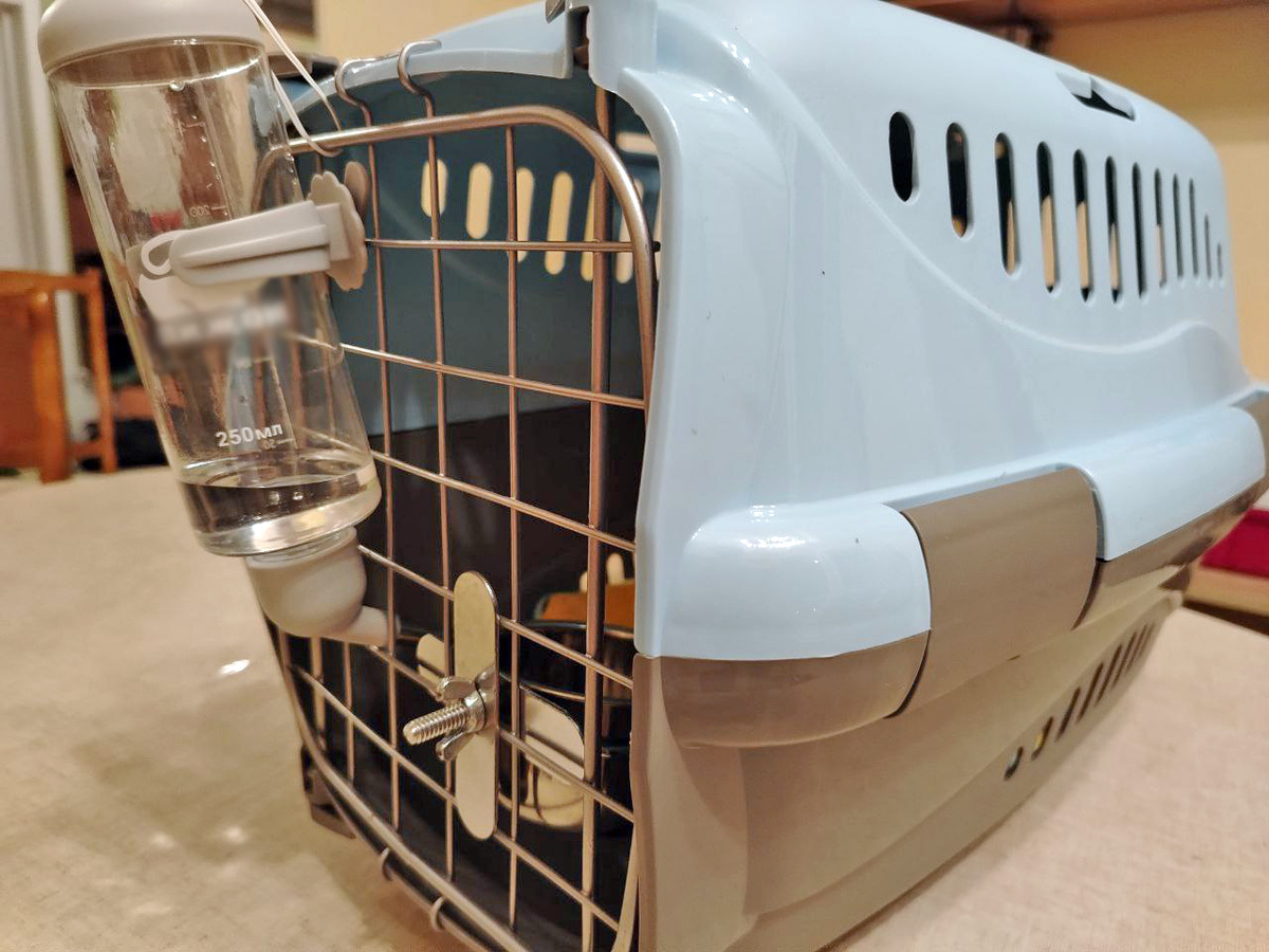 обязательно должны находиться в переноске во время длительной поездки. Прикреплять поилку и насыпать корм в кормушку нужно только тогда, когда переноска установлена на постоянное место для транспортировки - чтобы вода не расплескалась и корм не рассыпался.