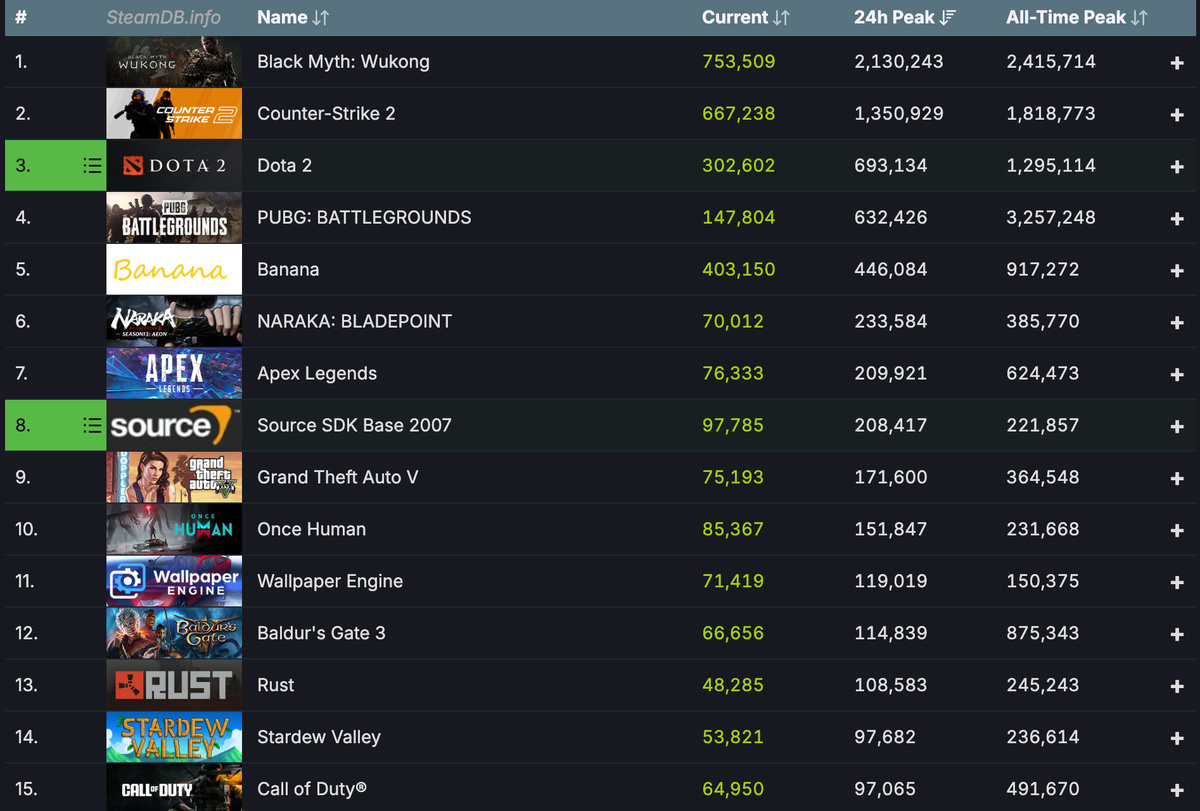 Сервис Steam установил новый рекорд по количеству одновременных игроков. В марте 2024 года сервис Valve достиг отметки в 36 миллионов игроков, а в воскресенье преодолел эту цифру, собрав более 37 миллионов одновременных пользователей. Более конкретно, Steam зафиксировал 37,266,324 одновременных игроков. Скорее всего, до конца этого года мы увидим 38 или даже 39 миллионов. Что касается самых популярных игр, то тут все достаточно ожидаемо. Самой популярной игрой за 24 часа была Black Myth: Wukong, поддерживающая поразительно высокую активность даже после пика на релизе. Кроме того в топе можно увидеть DOTA 2, PUBG: Battlegrounds и Banana — это кликер, в котором нужно кликать на банан. Игра бесплатна и, похоже, используется для каких-то финансовых манипуляций. Стоит отметить, что в топ-15 также вошли Baldur’s Gate 3, Stardew Valley и Call of Duty . Комментарии на сайте