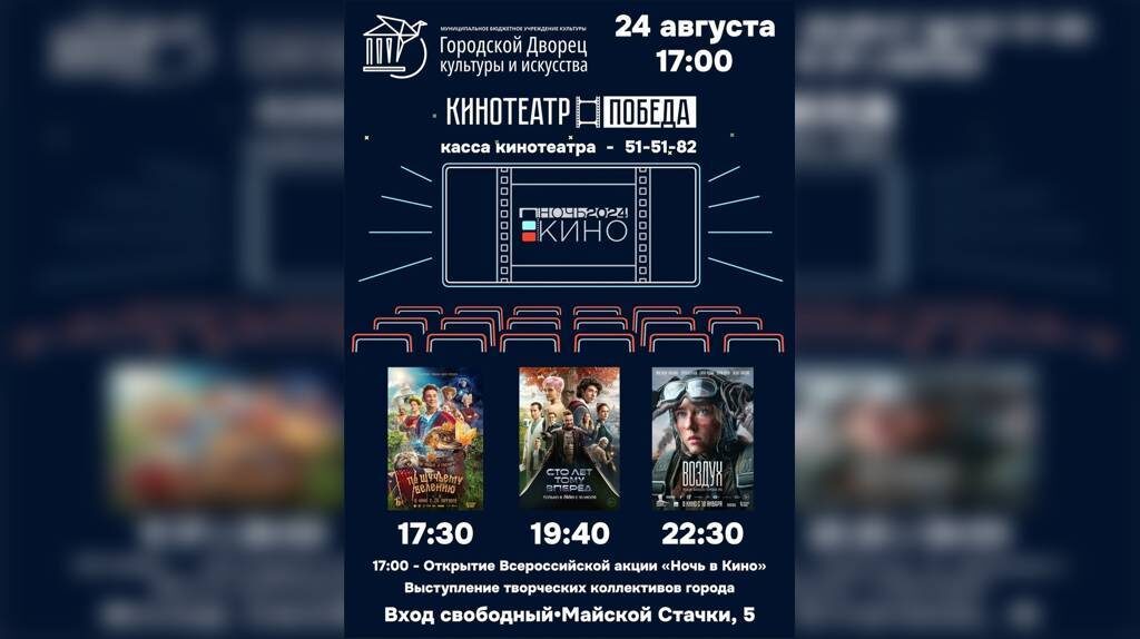 Брянская область принял участие во Всероссийской акции «Ночь кино». В регионе фильмы посмотрели более 6,5 тысяч человек. Ежегодно для «Ночи кино» выбираются три самые яркие новинки российского кинематографа. В программе 2024 года - фантастический блокбастер "Сто лет тому вперед" (16+), сказка "По щучьему велению" (6+) и военно-историческая драма "Воздух" (18+). На Брянщине в рамках акции работали 30 площадок. Зрители смогли посмотреть фильмы в учреждениях культуры: Брянска, Новозыбкова, Сельцо, Фокино, а также в 18 муниципальных районах Брянской области. В Брянской области более 6,5 тысяч человек приняли участие в акции «Ночь кино»