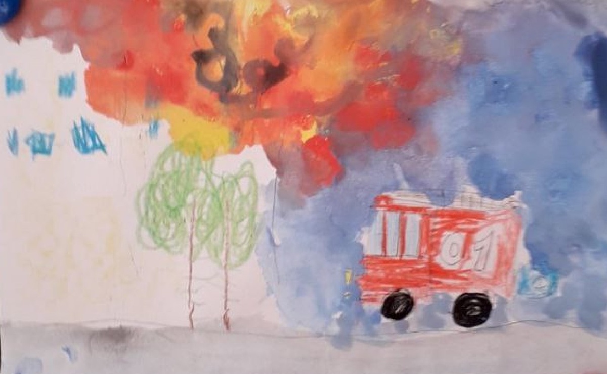 На рисунке изображена динамичная сцена с пожарной машиной, мчащейся к пожару. Пожар: Занимает верхнюю часть рисунка, выполнен в красных, оранжевых и желтых тонах. Клубы дыма изображены размытыми пятнами и завитками, создавая ощущение движения и хаоса. Внутри пожара можно различить темные силуэты, напоминающие языки пламени. Пожарная машина: Нарисована красным цветом с белыми полосами, обозначающими окна. Имеет четко прорисованные колеса, фары и номер "01". Машина изображена в движении, наклонена вперед, как будто спешит на вызов. Оставляет за собой след голубого дыма. Другие элементы: Деревья: Два зеленых дерева нарисованы слева от пожара. Они тонкие, с кронами, выполненными круговыми движениями зеленого карандаша. Здания: В левой части виднеются силуэты зданий, нарисованные синим цветом. Они частично скрыты дымом от пожара. Земля: Изображена серой линией в нижней части рисунка. Общие характеристики рисунка: Цвета: Доминируют яркие, насыщенные цвета: красный, оранжевый, желтый, синий,