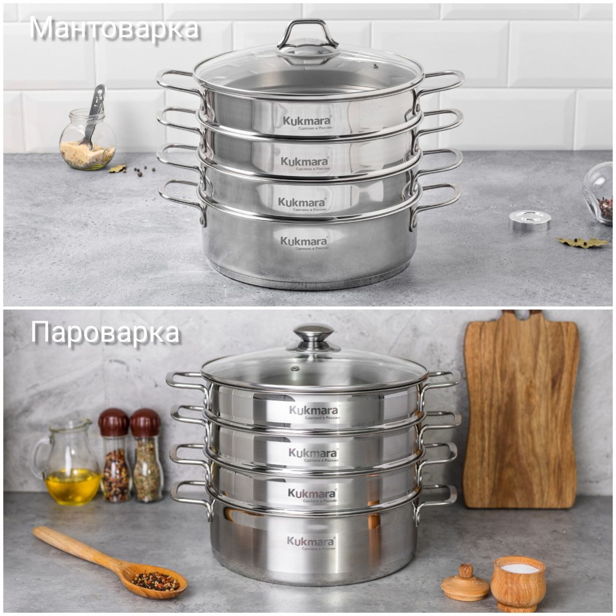Самая главная функция мантоварок и пароварок – приготовление блюд на пару. Их выбирают для приготовления ханума и мантов, однако и другие блюда в них получаются полезными, сохраняют максимальное количество полезных свойств. Изготавливаются мантоварки и пароварки Kukmara из высококачественной нержавеющей стали, имеют одинаковое количество (3 шт) секций, оснащены крышкой из жаропрочного стекла. Высота (71 мм) и толщина (0,5 мм) секций тоже одинаковы. В чем же различие? Ответ прост – в основании посуды. Основание мантоварки – кастрюля, имеет трехслойное теплораспределительное дно, толщина которого составляет 4,2 мм. Это является преимуществом мантоварки над пароваркой, толщина дна которой составляет 0,5 мм. Основание пароварки напоминает сотейник и имеет меньшие высоту и объем по сравнению с основанием мантоварки. Его рекомендуется использовать для приготовления компотов, первых и вторых блюд с добавлением жидкости. Жарить и тушить продукты в основании пароварки не рекомендуется из-за т
