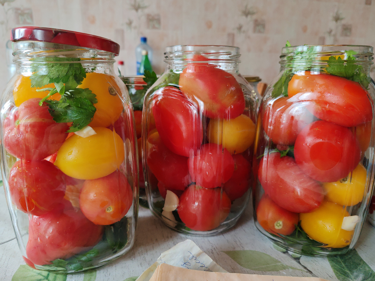 Помидоры в нашей семье любят и едят с огромным удовольствием. Чаще всего и ,наверное, любимые всего классический рецепт ,мы называем его "съешь меня". Расчет делаю на 3литровую банку,но предпочитаю закатывать в 1литровые банки, чтобы съесть можно было бы за раз, за вечер . На 3литровую банку, петрушка(на ваш вкус, я предпочитаю побольше) 2 лавровых листа, 6 горошен черного перца,3 столовых ложки соли, 6 столовых ложек сахарного песка. Уксус 9 процентный 50грамм. Заливаем первый раз уложенные в банки помидоры на 5 минут, воду сливаем делаем маринад ,добавляя все по списку выше. Заливаем маринадом банки с помидорами , даём остыть под шубой. Приятного аппетита!