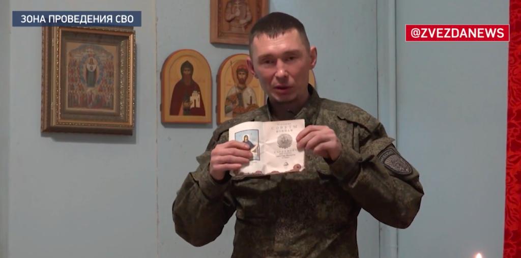 Российский солдат с позывным «Чемба» показал молитвенник «Молитвенный щит православного воина», который спас ему жизнь от осколка.