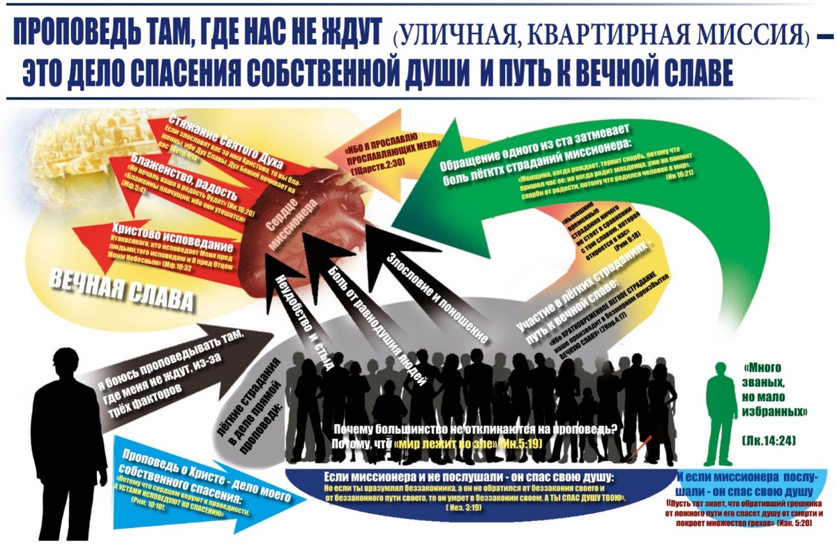 Прямая проповедь Христа в тех местах, где нас не ждут (квартирная и уличная миссия) – это: — исполнение Заповеди Христовой (Мф.28:20); — подражание Христу и апостолам (Господь мог не ходить по Палестине, но Сам смиренно этим занимался и посылал на то же Своих учеников); — школа терпения, школа борьбы с тщеславием, школа преодоления ложного стыда; — соучастие в боли Христа; — краткий путь к стяжанию Духа Божия, блаженства и радости (1Петр.4:14); — дело спасения собственной души (Иез.3:19), (Иак.5:20); — исповедание Христа (Мф.10:32); — лёгкие страдание, ведущие к вечной славе (2Кор.4:17), (Рим.8:18); — дело прославление Бога и обретения нетленной славы (1Царств.2:30). Сам вопрос «зачем проповедывать тем, кто нас не слушает?» имеет ложное основание, будто бы цель миссионерского служения – это приведение людей к Богу. Но, нет. Цель миссионерского служения – личное приближение ко Христу через исполнения Его заповеди. Если более кратко, то цель миссионера – Сам Христос. А обращенные люди – это дело Самого Господа, и миссионер не претендует, чтобы кого-нибудь «обратить», так как только Сам Бог может обратить грешника на путь истины. Итак, «Выйдем за стан, нося Его поругание» (Евр.13:13)