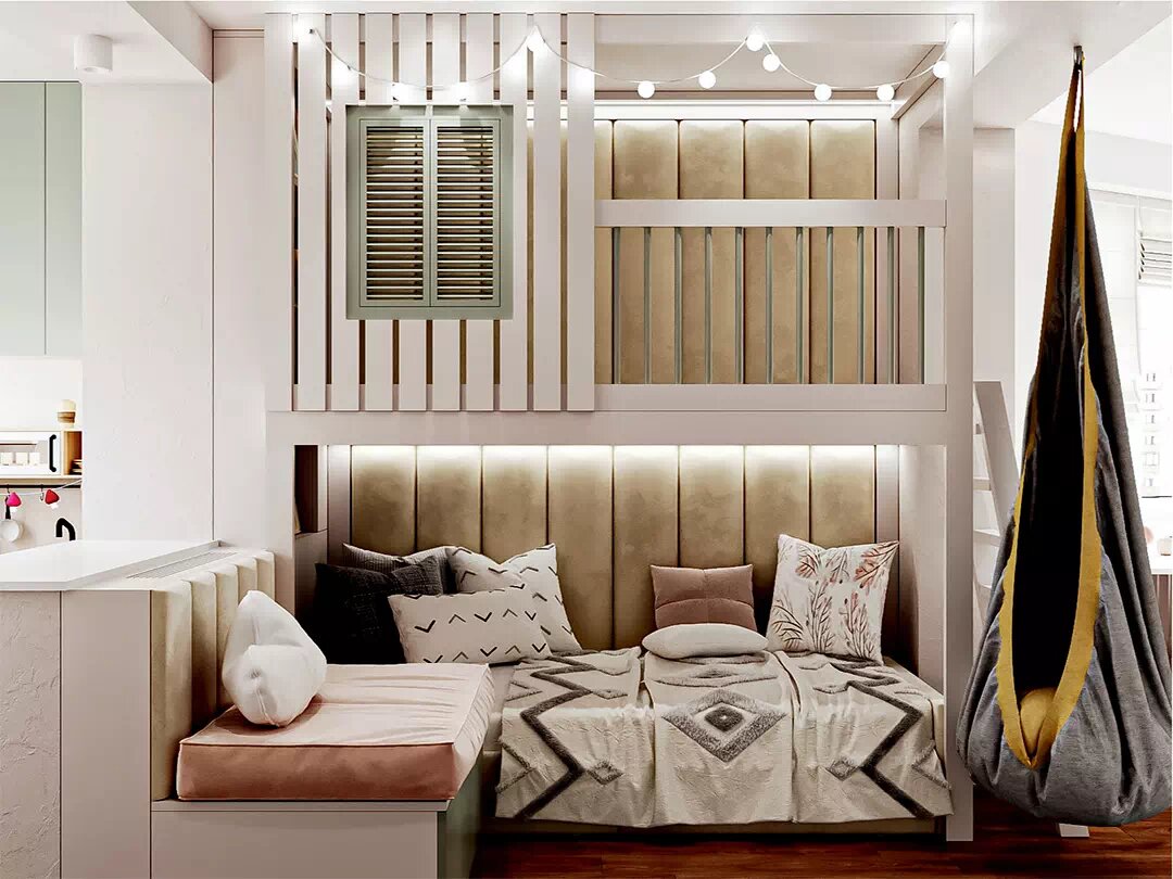 Оригинальная мебель в комнату для девочки 5 лет с уютной кроваткой, местами для отдыха, игровой и рабочей зонами, системой хранения. Подробнее тут Мебель в детскую комнату девочки размещена в соответствии с уникальным функциональным зонированием. Деление помещения, имеющего нестандартную геометрическую форму, выполнено с помощью потолочных балок и стеновых выступов. Напротив входа, перед Г-образно размещенными смежными окнами, располагается пространство для творчества и развития, которое позже послужит для выполнения учебных заданий. Здесь установлен стол с пятиугольной столешницей, опирающейся на тумбу с ящиками. Второй ее конец интегрируется в систему хранения. Уникальная мебель в комнату для девочки 5 лет изготовлена под заказ. В ее корпусе распашные дверцы комбинируются с открытыми полками и выдвижными ящиками. Дополнением конструкции выступает встроенный туалетный столик с парой ящичков. Перед ним – прямоугольное настенное зеркало с крупными лампочками по периметру. Стулья выбраны