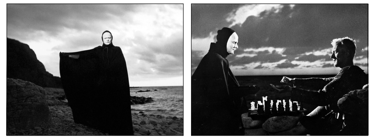 Интересный момент: в последнее время так много тревожных и неоднозначных событий происходит в общественном пространстве, а многие даже, как будто, не понимают и не чувствуют, что события и история сплелись в каком то своем удивительном и нереальном танце : вселенская ложь, насилие и смерть кружат хоровод, сжимая кольцо вокруг людей , простых и не очень. Образ смерти из фильма "Седьмая печать" Бергмана до гениальности прост. Но что же снится в такое время обычным гражданам, чувствуют ли спящие приближение катастрофы? Отнюдь. Молодым девушкам, снятся бывшие парни. Они никак не могут разобраться в том, почему не сложились их отношения. Мужчинам снятся обыденные вещи и очень редко , по настоящему что то важное. Ложась спать , люди чувствуют свое тело, оно здоровое или нет, чувствуют приближение болезни, но не чувствуют ничего, что витает в воздухе. В снах нет войны, в снах нет страха, нет смерти. Кадры из фильма "Седьмая печать" Ингмара Бергмана, 1957г. В роли смерти актер Бенгт Экерот (B