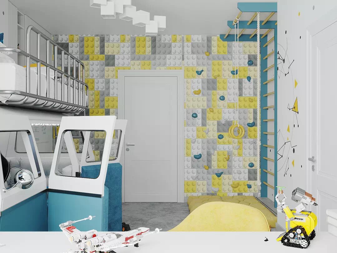 Мебель в комнату для мальчика с зоной сна и отдыха, рабочим пространством, спортивным уголком, системой хранения. Подробнее о проекте тут Необычная авторская мебель в детскую мальчика идеально вписывается в эксклюзивный интерьер. Область входных дверей оклеена обоями с 3D-эффектом. Она словно собрана из серых, белых и желтых элементов Lego. Именно в такой цветовой палитре, с бирюзовыми акцентами, оформлена комната. Все стены украшены графическими рисунками. Слева от входа располагается спортивный уголок. В нем находится двойная шведская лестница с перекладиной, канатом и гимнастическими кольцами. На полу с ковровым покрытием – толстый мат. Напротив спортуголка находится встроенный шкаф комбинированной конструкции. В его корпусе – две распашных дверцы, открытые полки, деть выдвижных ящиков, фасады которых оформлены узором из сот. На дверках имеются технические чертежи робота. Рядом уложены два больших бескаркасных прямоугольных пуфа с декоративной стежкой квадратами. Невероятно заманчив